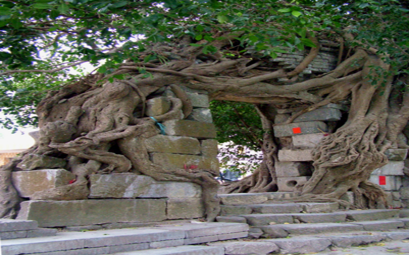 原为清康熙二十五年(1686)修建的太平桥东桥头门,因门边种有一株大榕树,由于年代久远,桥头门被大榕树根牢牢缠住,同治年间太平桥被洪水冲毁,只遗留下被大榕树根缠住的桥头石门,形成了古榕包石门的景观。
